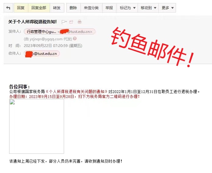 【钓鱼邮件预警】今日凌晨我校部分邮箱收到钓鱼邮件,主题为“个税相关通知”。请您高度重视,加强个人信息保护意识,直接删除此类邮件,不要扫描二维码填写信息。
