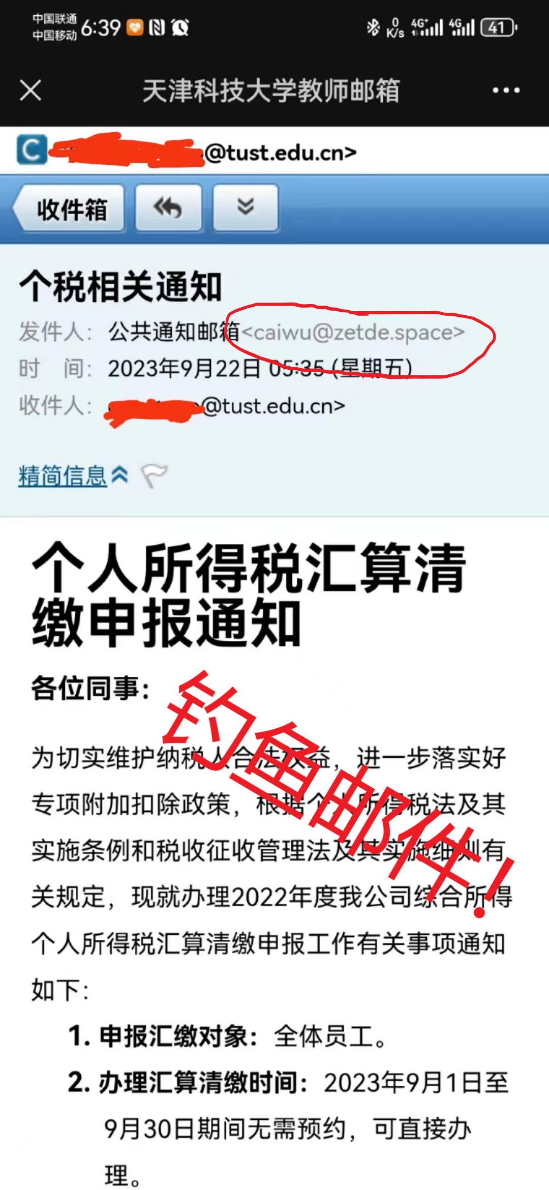 近期关于个人所得税的钓鱼/诈骗邮件猖獗,此类邮件引诱老师点击链接或扫码,非法获取身份证号,银行卡,手机号等信息,致使个人数据出现被窃取风险。钓鱼/诈骗邮件样本见附件。
